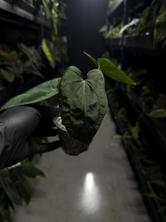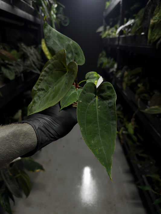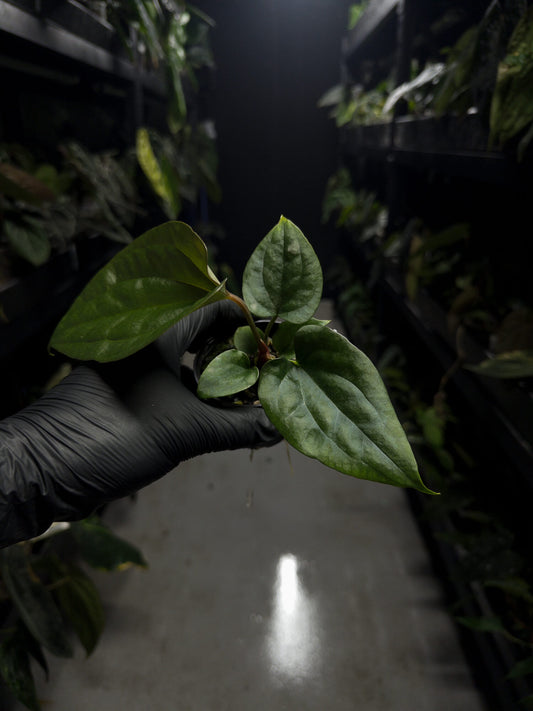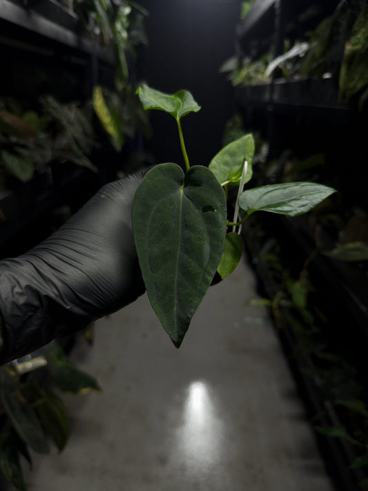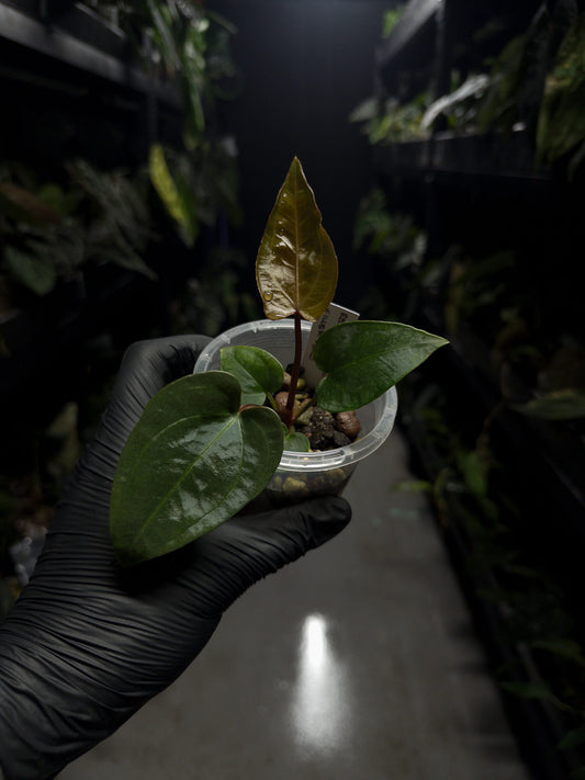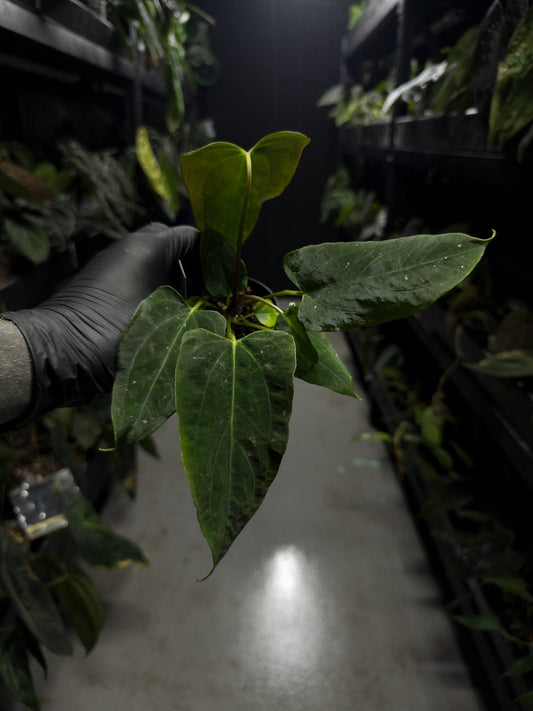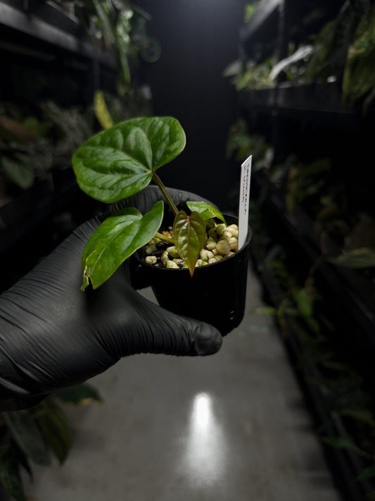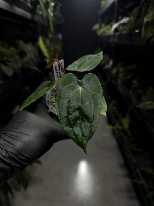 Anthurium papillilaminum x (antolakii x 'Dark Phoenix')