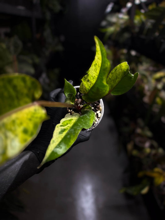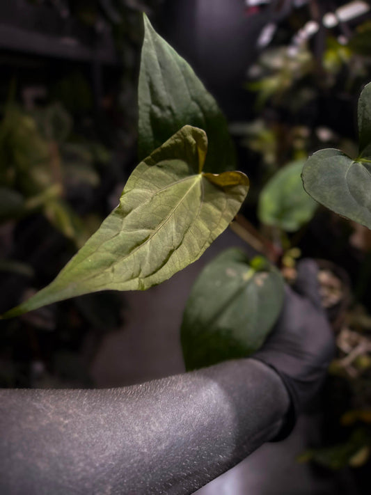 Anthurium papillilaminum hybrid 'Dropbear' x unknown